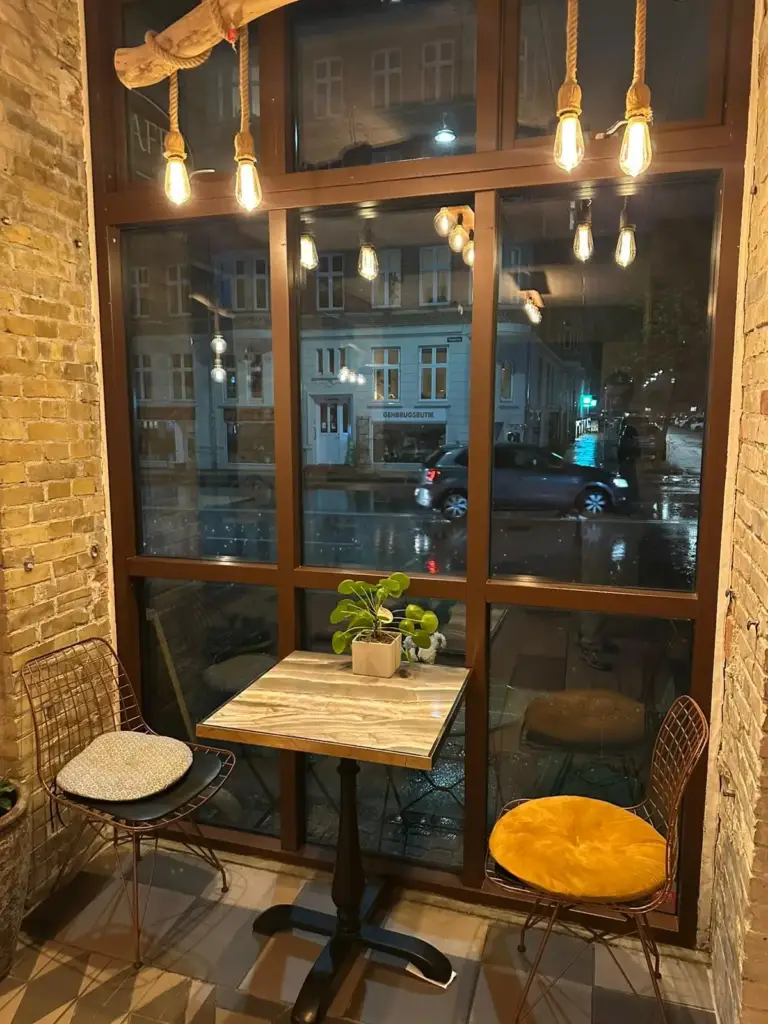 Om dagen tilbyder caféen frisk kaffe og kager, mens der om aftenen serveres specielle cocktails og lækre middagsretter.